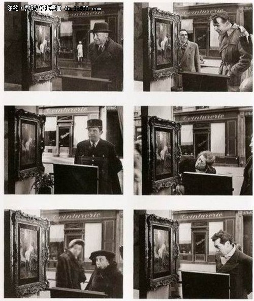 这是世界级摄影大师-杜瓦诺在他的一个朋友在巴黎开了一家艺术品商店拍摄的一组照片,他的朋友有一次购进了一幅瓦格纳的人体油画挂在橱窗里,杜瓦诺认为不同的人观看这幅油画定有形形色色不同的反应,于是他躲在反光的玻璃橱窗后面不易被人发觉的地方,驾好三脚架,进行了两三天的“守株待兔式”拍摄,结果“战果辉煌”。