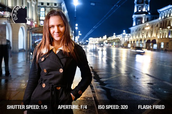在夜景人像模式下,相机会尽量平衡阴暗的背景和前景主体所需的曝光量之间的关系,为了拍摄到清晰的背景,光圈需要开的足够大以获得足够的光线。但同时也需要开启闪光灯照亮人物面部,避免低速的快门造成模糊。有些夜景人像模式可以闪光两次,以创造不寻常的双重曝光效果。
